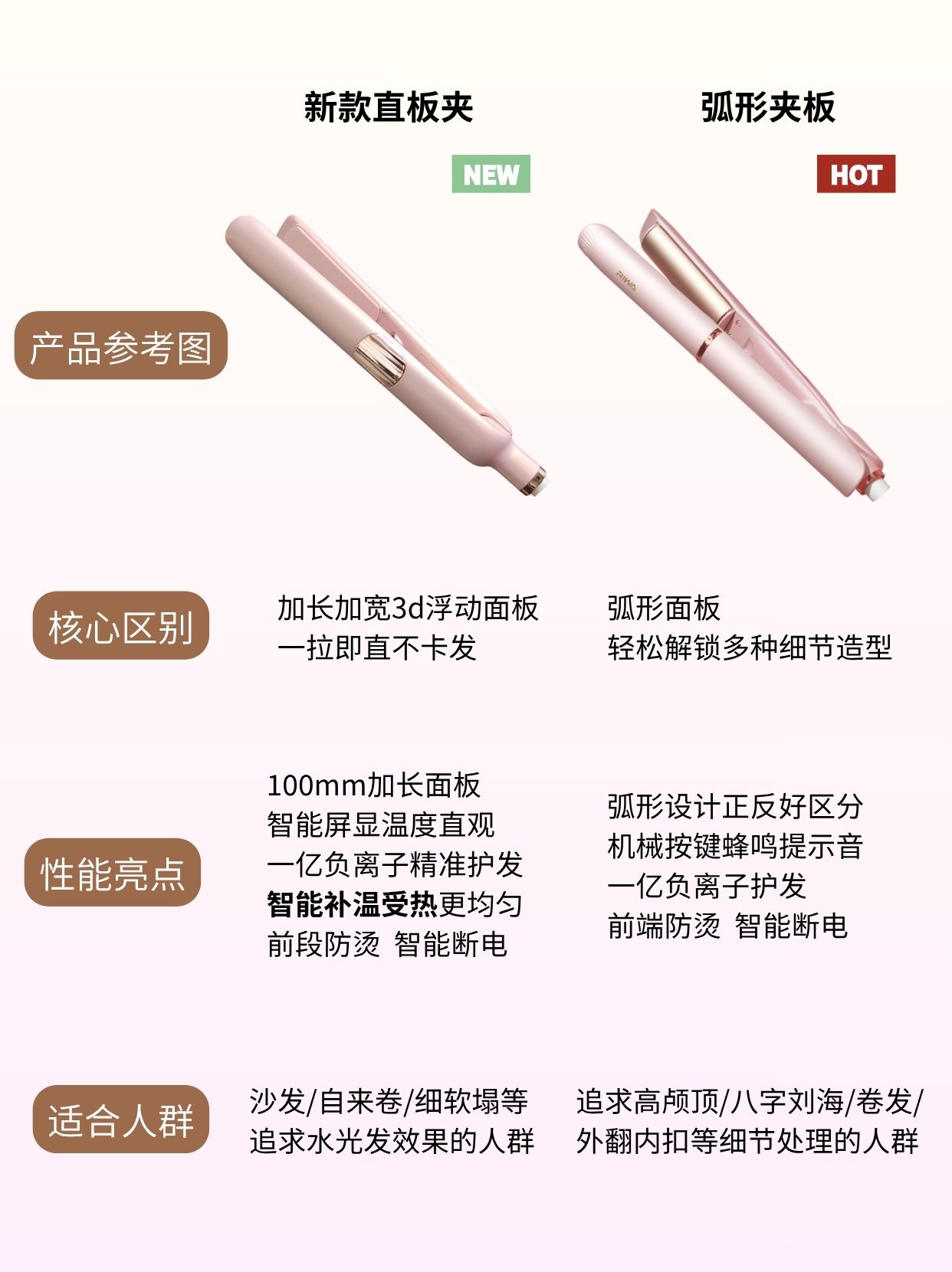 「直板夹」 🌟直卷两用神器,解锁百变发型!加长面板对沙发/长发超友好,边做造型变护理,一拉到底不卡发,头发顺滑光泽~ 「弧形夹板」 🟡 💗弧形面板设计细节处理更顺手~正反好区分,八字刘海,高颅顶,发尾轻松拿下🕶️ 卷出来的效果更自然~ 两款「都」配备了 ⏰蜂鸣提示音 💧1亿负离子护发 🔥30分钟智能断电+30s速热和三重防烫 小孩子才做选择,大人统统拿下