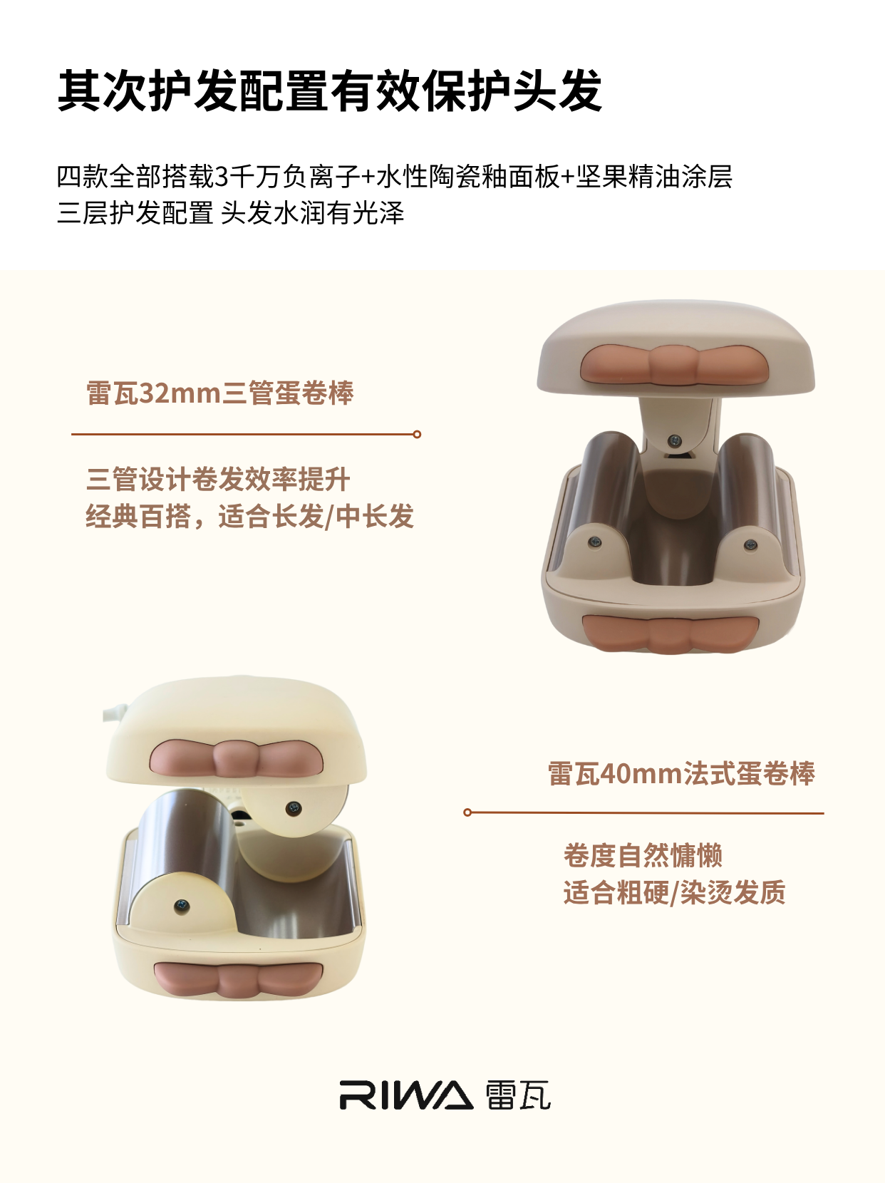 ▪️32mm两管:日常百搭氛围感🍦 最不挑人的百搭款,中长发闭眼入,塑造慵懒随性的韩式水波纹,日常出门快速搞定。 ▪️32mm三管:发量富翁多巴胺🌹 三管齐下,效率大幅度提升,卷度更立体蓬松,瞬间变身“发量富翁”,细软塌持久保持器。 ▪️40mm:温柔法式浪漫风🎀 卷度最大最自然,适合长发,塑造温柔显气质的法式大波浪,浪漫氛围拉满。 为什么选择雷瓦? ✅「可爱,不止于外表」专注造型产品【12】年,首发【🐱猫爪蛋卷棒】引领蛋卷潮流, 颜值实力在线 ✅「三千万负离子」 边做造型边养发,发丝不毛躁,光泽度满分 ✅「新手一秒上手」 智能控温+蜂鸣提醒+安全防烫,手残党也能轻松变美! 告别选择困难,找到你的本命蛋卷棒,每天都是新发型!