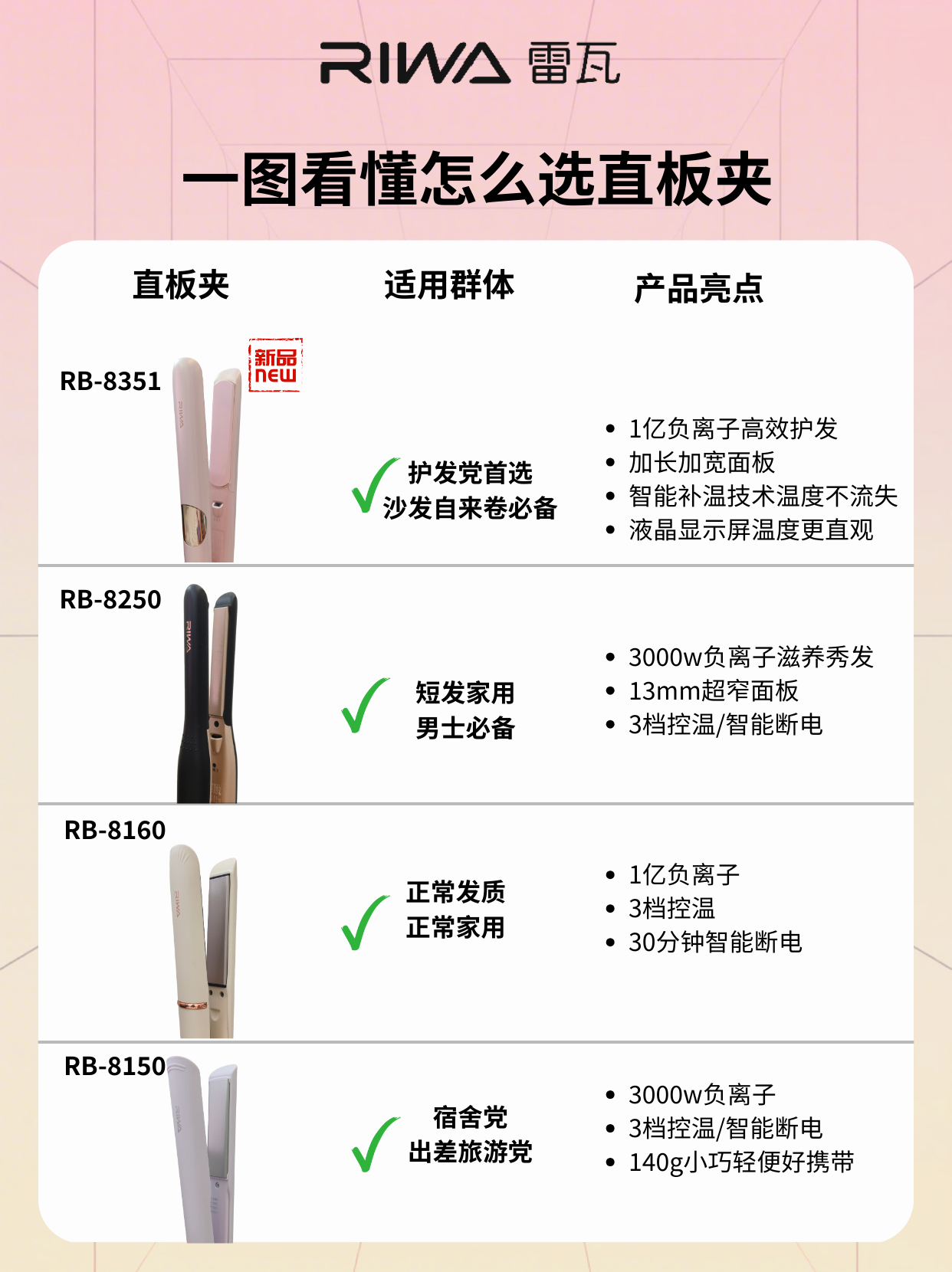 1️⃣ 便携直板夹(💰70+) ▫️3000万负离子 ▫️迷你机身+智能断电 ▫️适合旅行应急|学生党友好 2️⃣ 细窄直板夹(💰100+) ▫️3000万负离子+细窄面板 ▫️精准打理刘海&发尾 ▫️新手入门必备 3️⃣ 家用直板夹(💰120+) ▫️1亿负离子+宽面板 ▫️适合中长发|干发速度快 ▫️家庭共享性价比之选 💖【新款重磅】加长加宽直板夹(💰150+) ✔️1亿负离子+智能补温 ✔️液晶屏实时显温|防烫手 ✔️加长加宽面板|3分钟搞定全头 👉适合发量多/长发姐妹|智能补温护发沙龙级体验 🌟选购tips: 发量少选细窄|常出行选便携 家用追求性价比选中宽 发量多/要求高直接冲新款!